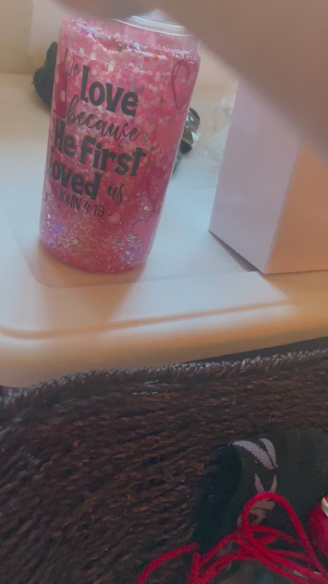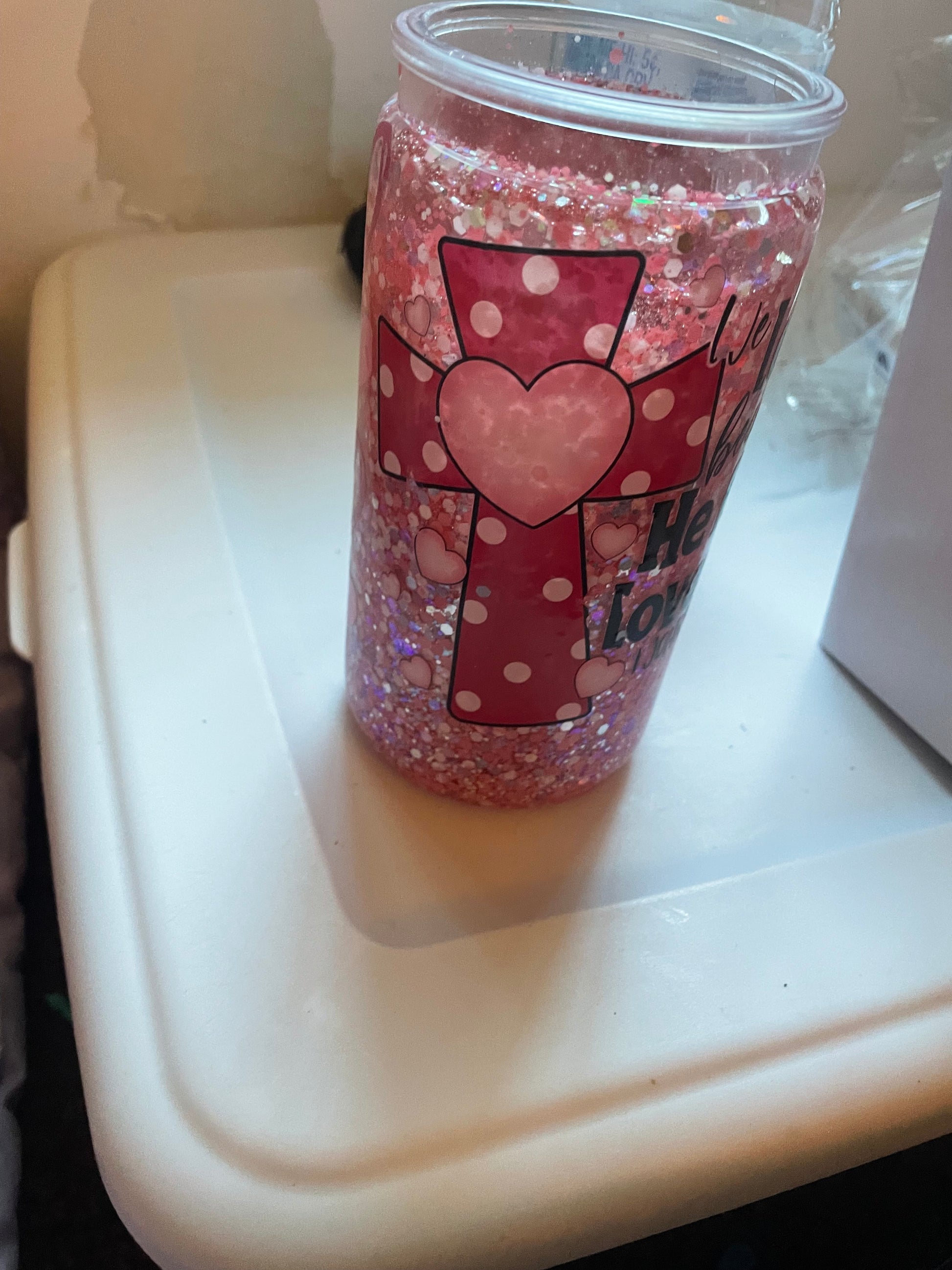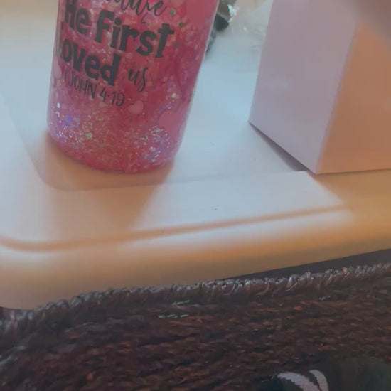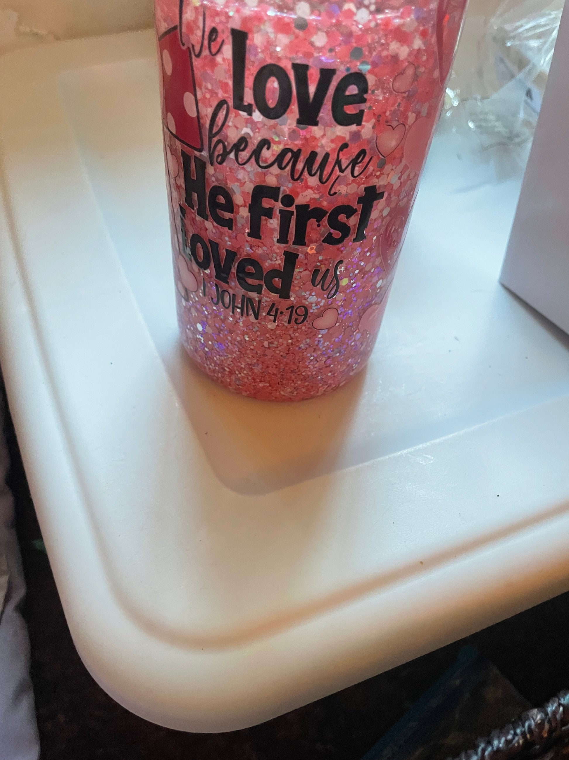 Beautiful pink glitter cup with little hints of white and sliver glitter and has the quote from John 4.19 on it. Comes with lid and straw. Plastic