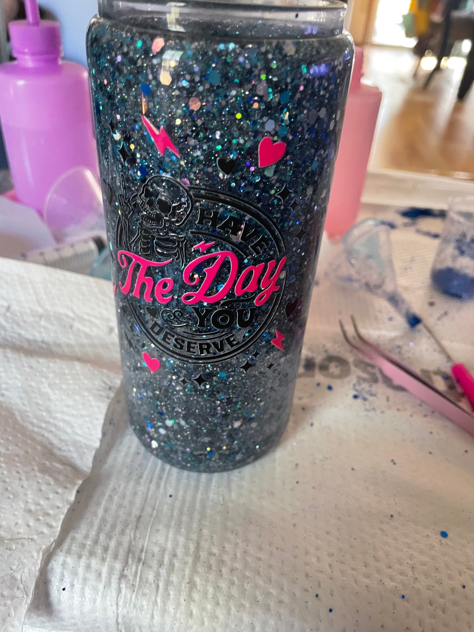 Blue and gray glitter cup with 2 decals. 16 0z with bamboo and straw.