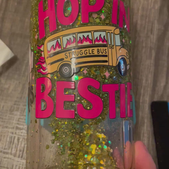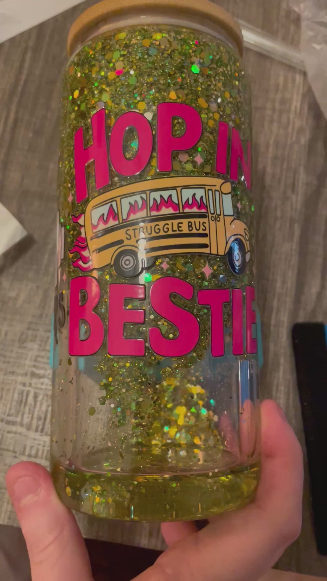Beautiful gold cup glitter cup. With bamboo lid and straw. Has 3 decals on it.