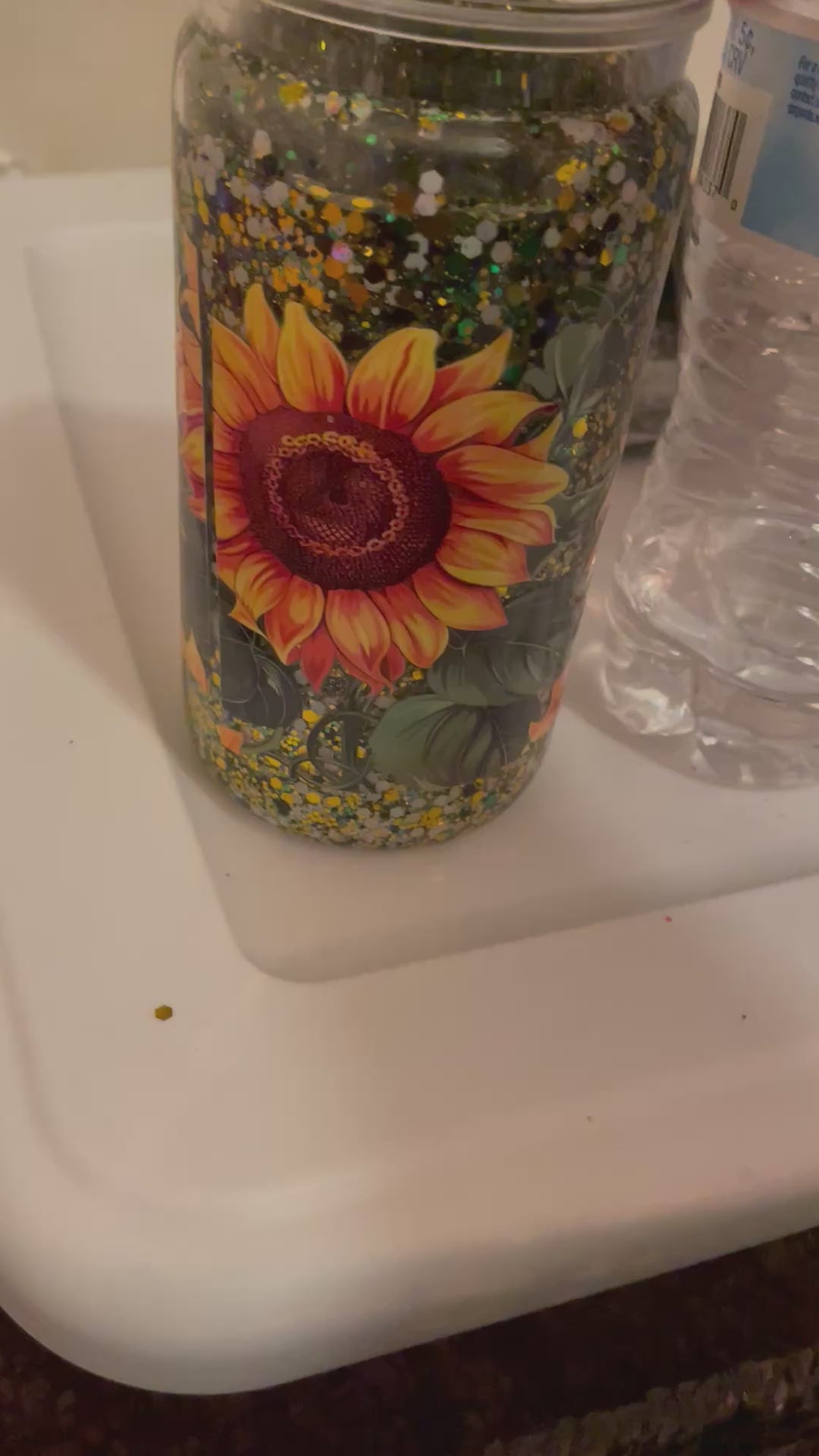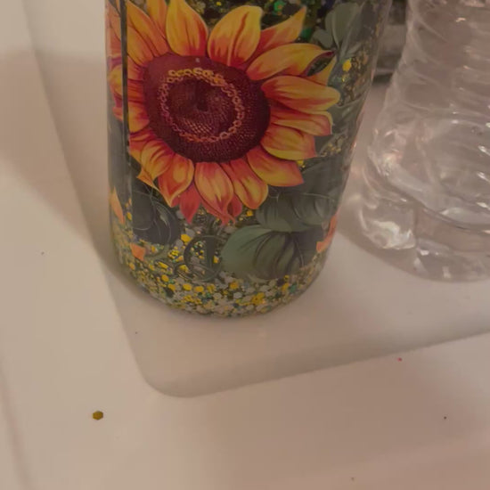 Beautiful sunflower glitter snow globe cup. Comes with lid and straw. Plastic
